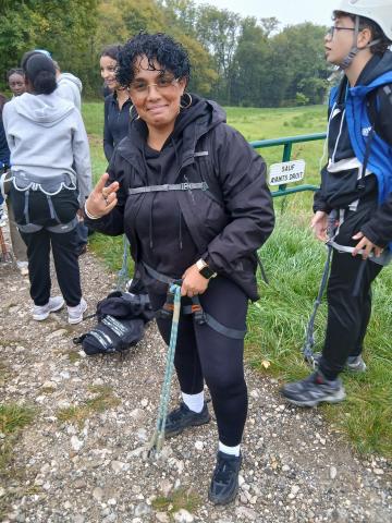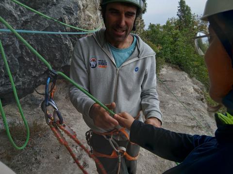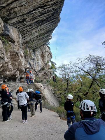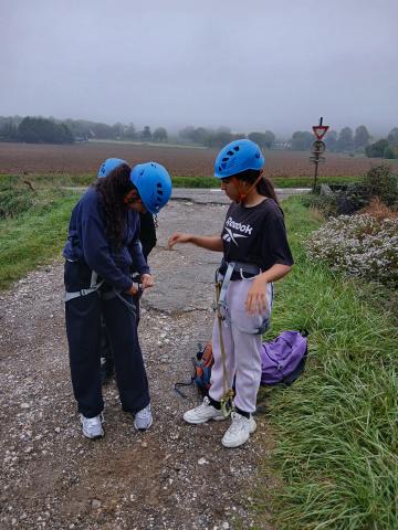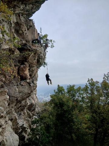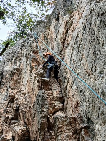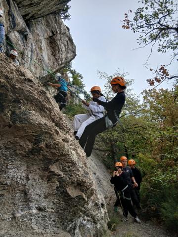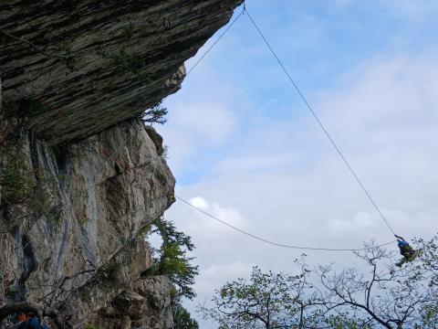 We also did some exercises in the mountain, like how to put the harness on and how to open and close the carabiner.At one moment, I had to climb up some kind of ladder. Then I had to let go and I was thrown out in the air. It was a bit scary but very fun.We ate around 1 pm and the whole day was really cool. The sun was hot but we had fun all the time.It was a really exciting day. I want to go climbing again.
